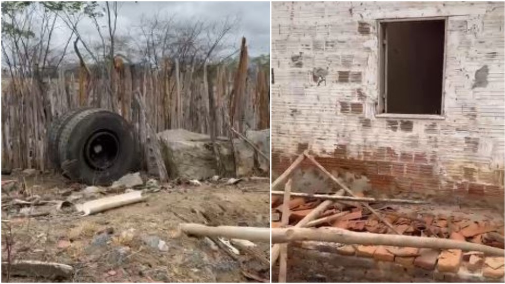 Fotos do local mostram o colapso parcial do alpendre após a colisão e um buraco no telhado da cozinha, com diversas telhas espalhadas pelo chão. O pneu só foi parar no quintal da casa.